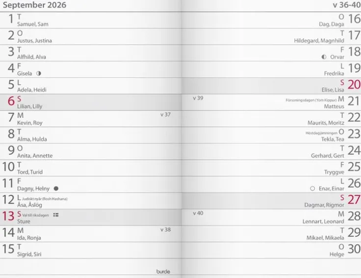 Kalender 2026 från Burde. Format: 67×105 mm. Layout: Liggande. Månad/uppslag. Kalendarium: 2026-01-01 – 2026-12-31. Omslag: Kartong. Häftklamrad. Innehåll: Flaggdagar, helgdagar/aftnar, månfaser, namnsdagar, temadagar/händelser, årsöversikt/årsöversikter,. Antal sidor: 32. Miljöinformation: FSC®.