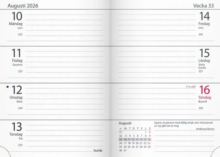 Kalender i smakfullt omslag med textillik struktur.>Kalender 2026 från Burde. Format: 70×100 mm. Layout: Liggande. Vecka/uppslag. Kalendarium: 2025-12-22 – 2027-01-03. Omslag: Konstläder. Inbunden. Detaljer: Märkband. Innehåll: Kyrkliga helgdagar, flaggdagar, helgdagar/aftnar, månfaser, namnsdagar, internationella helgdagar översikt, temadagar/händelser, årsöversikt/årsöversikter, årsplan/årsplaner, atlas, telefonregister. Antal sidor: 192. Miljöinformation: FSC®.
