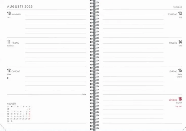 Kalender med mjuk pärm i konstläder med den populära flärpen som kan användas som bokmärke. Kalendern har ett uppslag med liggande layout där fokus ligger på tydlig veckoplanering. Inlagans layout passar dig som har mycket på gång, oavsett veckodag. Kalendern är enkel och tydlig med lika mycket utrymme för både vardag och helg.>Kalender 2026 från Burde. Format: A5. Layout: Liggande. Vecka/uppslag. Kalendarium: 2025-12-08 – 2027-01-03. Omslag: Konstläder. Spiralbunden. Innehåll: Kyrkliga helgdagar, flaggdagar, helgdagar/aftnar, månfaser, namnsdagar, temadagar/händelser, årsöversikt/årsöversikter, årsplan/årsplaner,. Antal sidor: 144. Miljöinformation: FSC® papper.