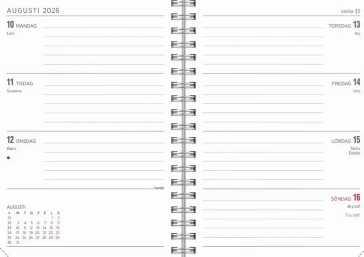 Detta textilomslag med det präglade årtalet ger ett stilrent och elegant intryck som passar året om. Ett klassiskt uppslag med liggande layout där fokus ligger på tydlig veckoplanering. Inlagan passar dig som har mycket på gång, oavsett veckodag. Kalendern är liten och enkel och med lika mycket utrymme för både vardag och helg.>Kalender 2026 från Burde. Format: A6. Layout: Liggande. Vecka/uppslag. Kalendarium: 2025-12-08 – 2027-01-03. Omslag: Linnetextil. Spiralbunden. Innehåll: Kyrkliga helgdagar, flaggdagar, helgdagar/aftnar, månfaser, namnsdagar, temadagar/händelser, årsöversikt/årsöversikter, årsplan/årsplaner,. Antal sidor: 144. Miljöinformation: FSC®.