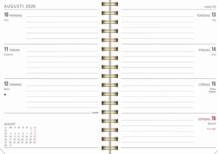 Kalender 2026 med årtal präglat i guld och med en guldspiral. Format: A6. Layout: Liggande. Vecka/uppslag. Kalendarium: 2025-12-08 – 2027-01-03. Omslag: Kartong. Spiralbunden. Antal sidor: 144. Miljöinformation: FSC®.