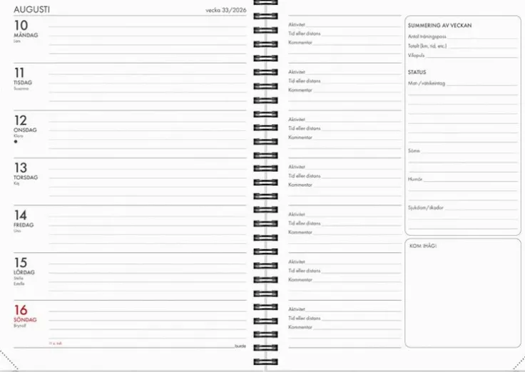 Träningskalendern hjälper dig att få sunda vanor i din vardag, men även att behålla dem över tid. Kalendern passar dig som vill ha en allsidig träning med en kombination av löpning och styrketräning. Det ingår även ett program för dig som vill komma i gång med meditation och andningsövningar så att den mentala träningen blir en naturlig del av din vardag också. Båda programmen är signerade löpcoachen och PT:n Jenny Sunding. Jenny ger också hälsosamma tips som håller inspirationen vid liv hela året. På varje uppslag finns dels en kalendersida med veckoplanering och dels en aktivitetssida. Träningskalendern har ett funktionellt plastomslag för att kunna följa med dig på träningspassen och även 2 framsidor att växla mellan.>Kalender 2026 från Burde. Format: A5. Layout: Liggande. Vecka/uppslag. Kalendarium: 2025-12-22 – 2027-01-03. Omslag: PP-plast. Spiralbunden. Detaljer: Gummiband. Innehåll: Kyrkliga helgdagar, flaggdagar, helgdagar/aftnar, månfaser, namnsdagar, temadagar/händelser, årsplan/årsplaner,. Antal sidor: 160. Miljöinformation: FSC®.