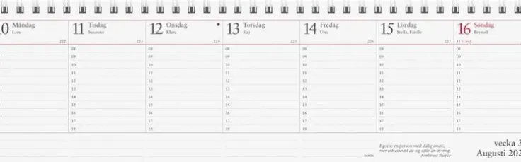 Kalender 2026 från Burde. Format: 305×90 mm. Layout: Stående. Vecka/uppslag. Timindelning 8-18. Kalendarium: 2025-12-22 – 2027-01-03. Omslag: Kartong. Spiralbunden. Innehåll: Kyrkliga helgdagar, flaggdagar, helgdagar/aftnar, månfaser, namnsdagar, temadagar/händelser, årsöversikt/årsöversikter,. Antal sidor: 56. Miljöinformation: FSC®.