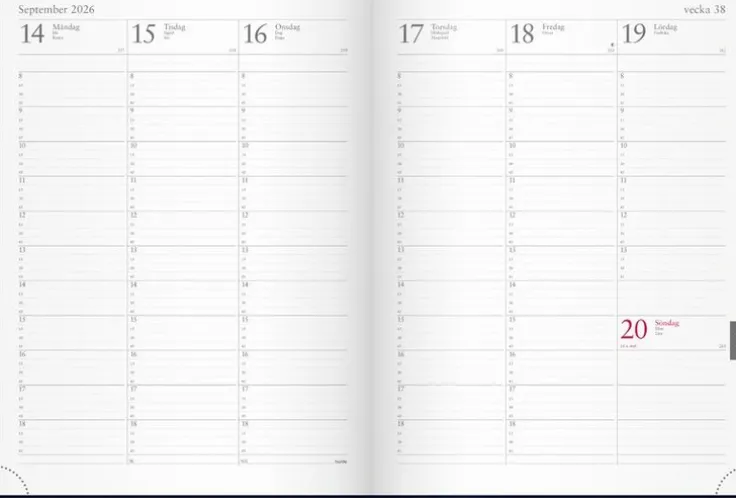 Kalender 2026 från Burde. Format: 195×260 mm. Layout: Stående. Vecka/uppslag. Kvartsindelning 8-19. Kalendarium: 2025-12-29 – 2027-01-03. Omslag: Konstläder. Inbunden. Detaljer: Märkband. Innehåll: Kyrkliga helgdagar, flaggdagar, helgdagar/aftnar, internationella helgdagar, månfaser, namnsdagar, internationella helgdagar översikt, temadagar/händelser, årsöversikt/årsöversikter, årsplan/årsplaner,. Antal sidor: 112. Miljöinformation: FSC®.