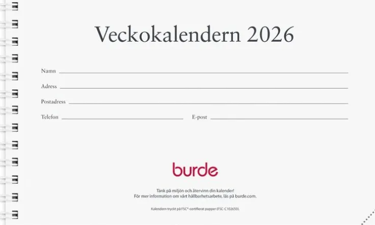 Kalender 2026 från Burde. Format: 148×90 mm. Layout: Stående. Vecka/uppslag. Timindelning 8-17. Kalendarium: 2025-12-15 – 2027-01-03. Omslag: Kartong. Spiralbunden. Innehåll: Kyrkliga helgdagar, flaggdagar, helgdagar/aftnar, månfaser, namnsdagar, internationella helgdagar översikt, temadagar/händelser, årsöversikt/årsöversikter, årsplan/årsplaner,. Antal sidor: 128. Miljöinformation: FSC®.