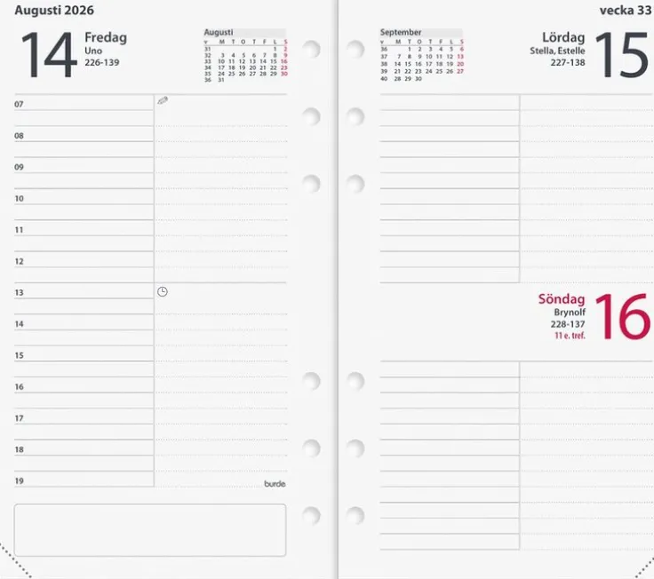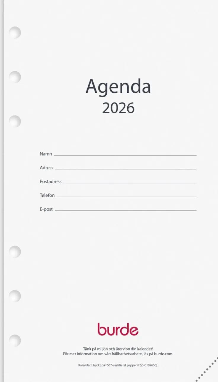Hålad kalenderrefill till systemkalender med ringmekanism.>Kalender 2026 från Burde. Format: 95×170 mm. Layout: Stående. Dag/sida. Timindelning 7-19. Kalendarium: 2025-12-22 – 2027-01-03. Omslag: Kartong. Innehåll: Kyrkliga helgdagar, flaggdagar, helgdagar/aftnar, månfaser, namnsdagar, internationella helgdagar översikt, temadagar/händelser, årsöversikt/årsöversikter, årsplan/årsplaner,. Antal sidor: 352. Miljöinformation: FSC®.