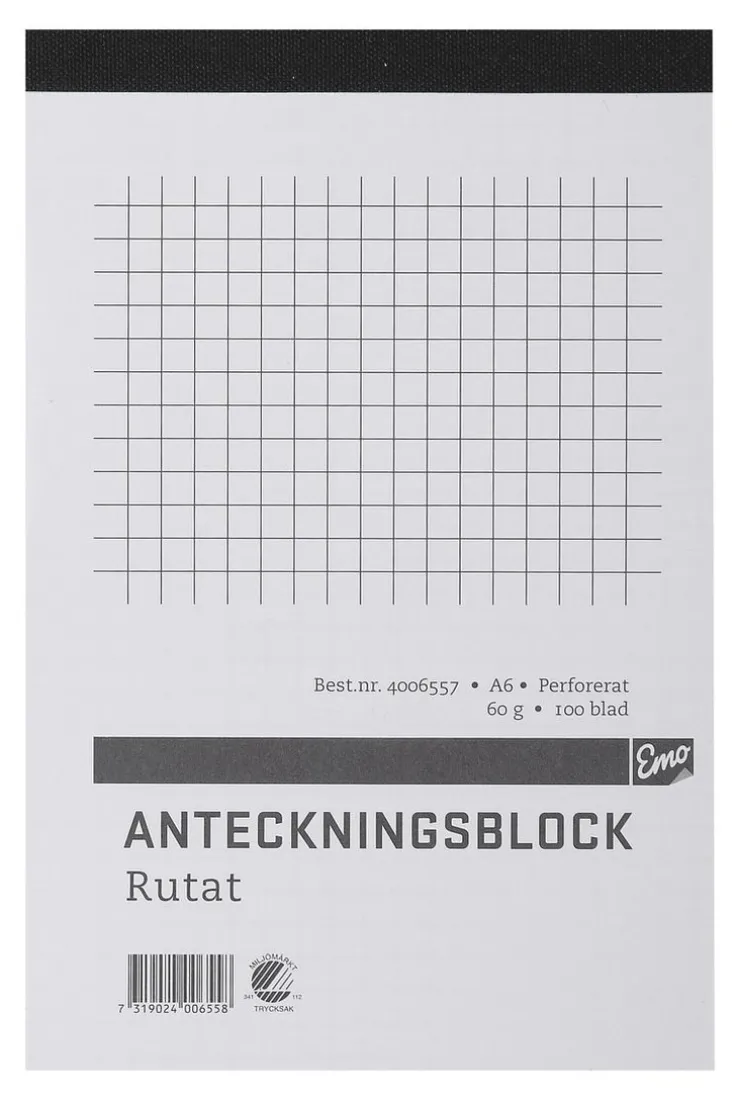 Anteckningsblock häftade på stödskiva. Skrivpapper. Perforerade. A6, rutat, ohålat, 60 g, 100 blad.