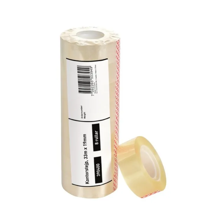 Semitransparent kontorstejp av bra kvalitet med kärna i plast. Allround tejp för kontor, hem, skola och emballering. Mått: 33 m x 19mm. Material: PP. Levereras i sampack med 8 rullar.