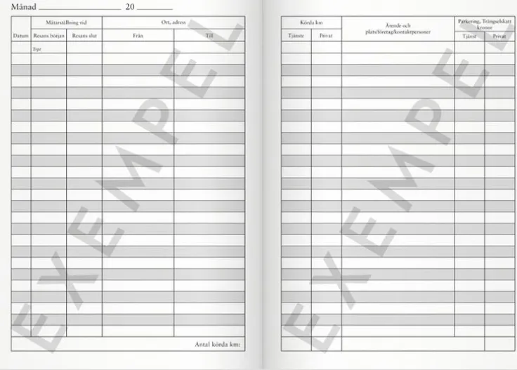 Kolumner för datum, mätarställning, ort, adress (till, från), körda km (tjänst, privat), ärende och plats/kontaktpersoner, parkering, trängselskatt (tjänst, privat). 32 sid. Häftad. FSC®. Format: A5.