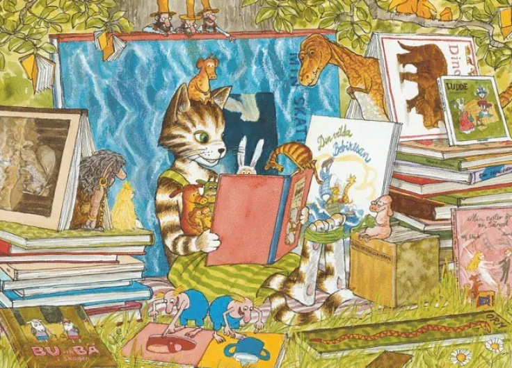Specialmotiv av Sven Nordqvist där Findus läser barnböcker.