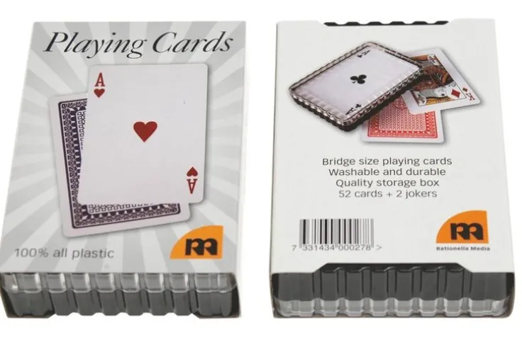 Bridgekortlek i 100% plast från Rationella Media . Plastkort är långlivade och kan tvättas försiktigt med tvål och vatten.Observera att det inte går att välja färg, ett av alternativen kommer att levereras.
