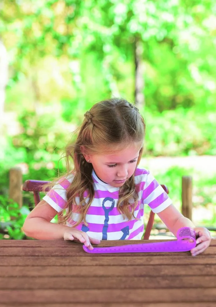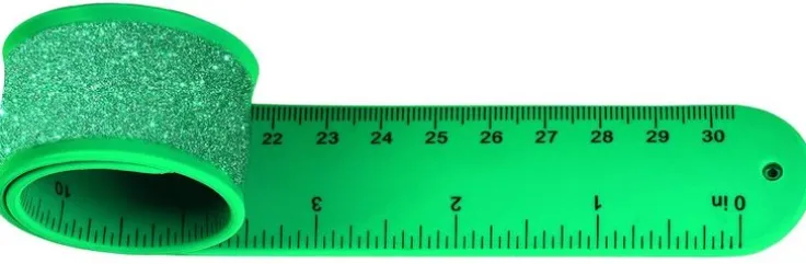 Linjal med glitter. Linjalen är 30 cm lång men kan rullas ihop så den kan få plats i ett pennfodral. Linjalen kan användas som ett glittrigt armband. Millimeterskala på ena sidan.
