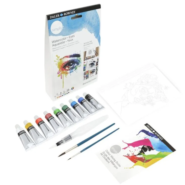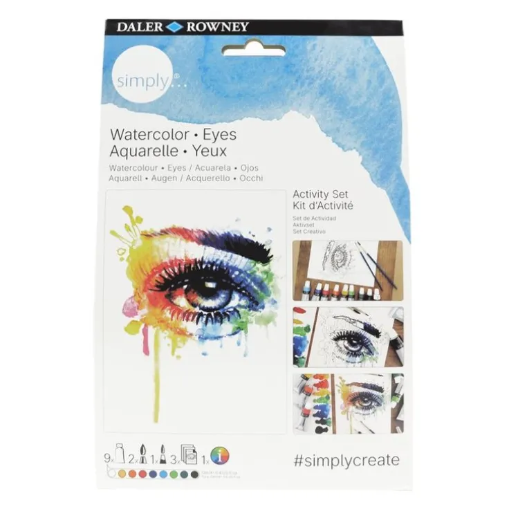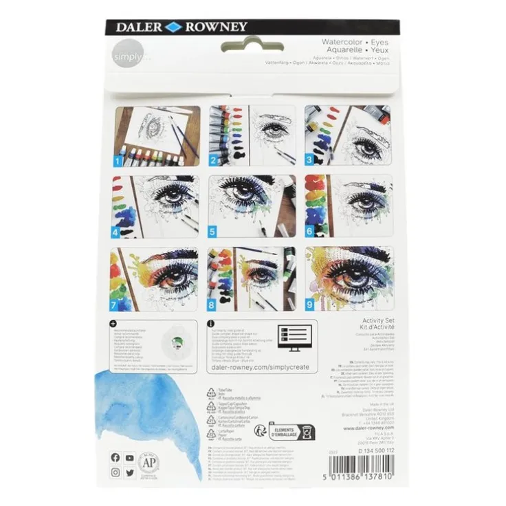 Simply Watercolour Eyes Activity Set från Daler-Rowney är det perfekta start setet för dig som vill prova på att måla med akvarell. Detta är ett paint-by-number inspirerat aktivitet set med förtryckta pappers ark för att skapa vackra konstverk med ögonmotiv. Setet innehåller: en Steg-för-steg guide, 9 tuber akvarelllfärg á 12 ml i färgerna: white, deep yellow, orange, primary red, ultramarine, coeruleum hue blue, hooker’s green, leaf green och black, samt 2 penslar i olika storlekar, en vattenpensel, färgblandningsguide samt 3 förtryckta pappersark med ögonmotiv i A5-format för akvarellmålning. Tillverkad i Storbritannien.