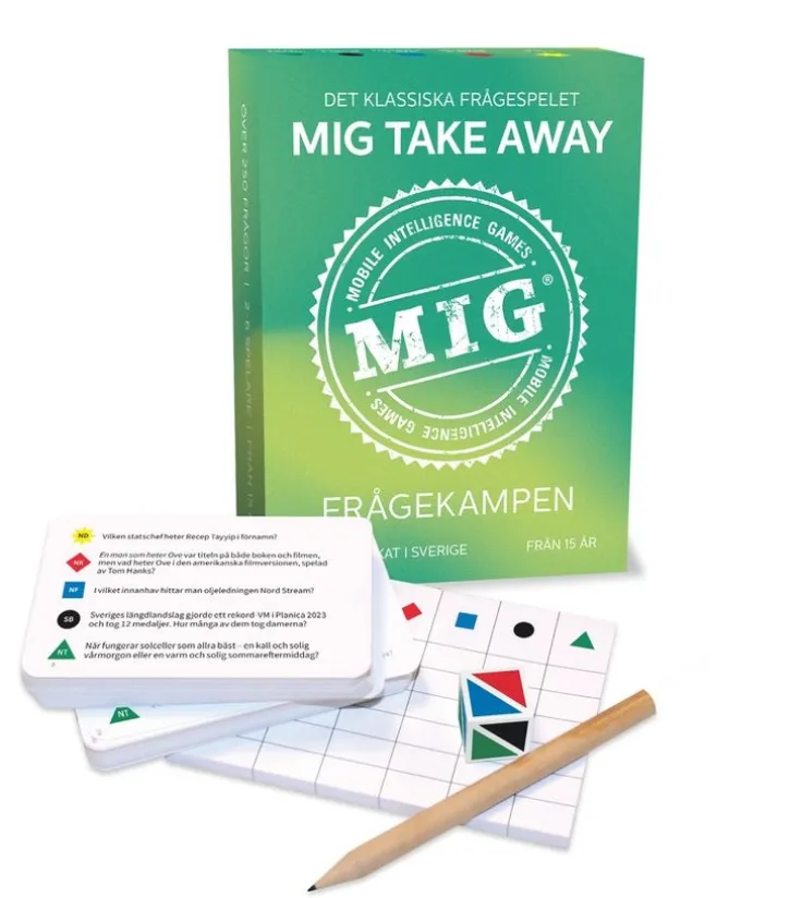 MIG TAKE AWAY är en serie klassiska frågespel i fyra olika varianter för både vuxna och barn. MIG Take Away Frågekampen är fyllt med en härlig blandning av roliga, aktuella och klassiska frågor. Ett spel för alla som älskar spelkvällar och gillar att lära sig något nytt. Över 250 underhållande frågor, lätt att packa med. Tillverkad i Sverige av Playmig. Innehåll: Över 250 frågor, fem frågekategorier, spelblock, MIG-färgtärning, regler och penna. 2-6 spelare eller spela i lag. Speltid från 15 min