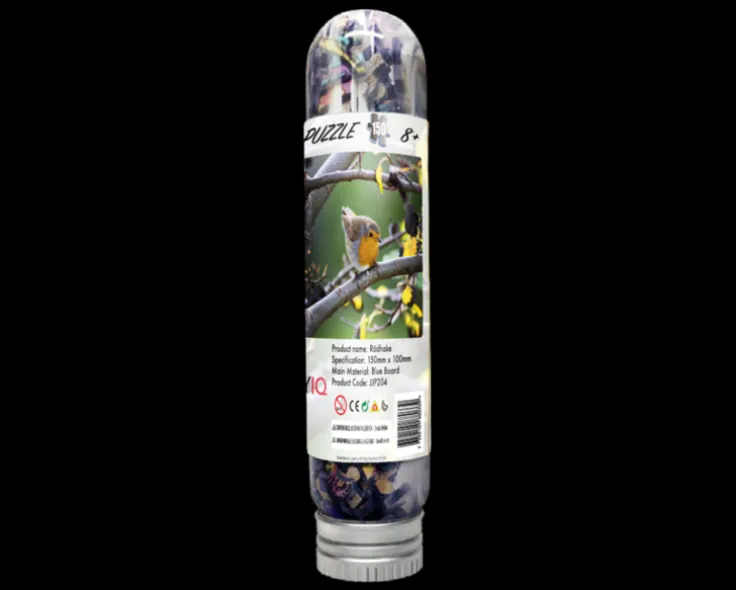 Lägg ett minipussel på 150 bitar med ett motiv av en vacker rödhake. När det är färdiglagt har det storleken av ett vykort (10×15 cm). Bild på motivet ligger i tuben.