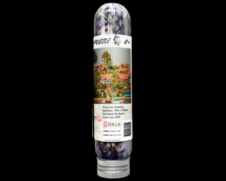 Lägg ett minipussel på 150 bitar med ett motiv av en sommarstugeidyll. När det är färdiglagt har det storleken av ett vykort (10×15 cm). Bild på motivet ligger i tuben.