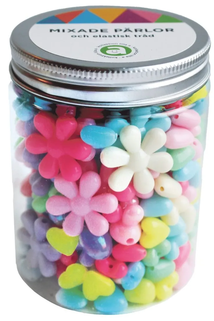 En praktisk burk med pärlor i olika färger och storlekar samt elastisk tråd. Dessa pärlor är perfekta för att skapa armband, halsband, nyckelringar och mycket mer. Endast fantasin sätter gränser! </brEn rolig aktivitet för stora som små där man kan skapa unika kreationer i regnbågens alla färger! Pärlorna ingår i Akademibokhandelns egen kollektion – Kollektion lilla a.