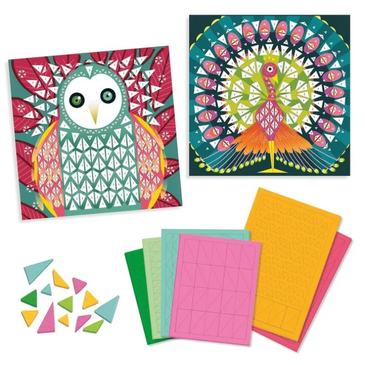 Ett kreativt och färgstarkt mosaikpyssel för lite äldre barn som gillar att pyssla! Med självhäftande skumfigurer i sex olika färger och former bygger barnet fantasifulla 3D-motiv – bland annat två glada fågelbilder att dekorera. De triangelformade bitarna ger ett spännande sätt att utforska mosaikteknik, samtidigt som barnet tränar tålamod, precision och finmotorik. Setet innehåller två illustrerade bildkort, färgglada foamstickers och en tydlig steg-för-steg-guide som gör det enkelt att komma igång. En rolig och lärorik aktivitet för kreativa barn!