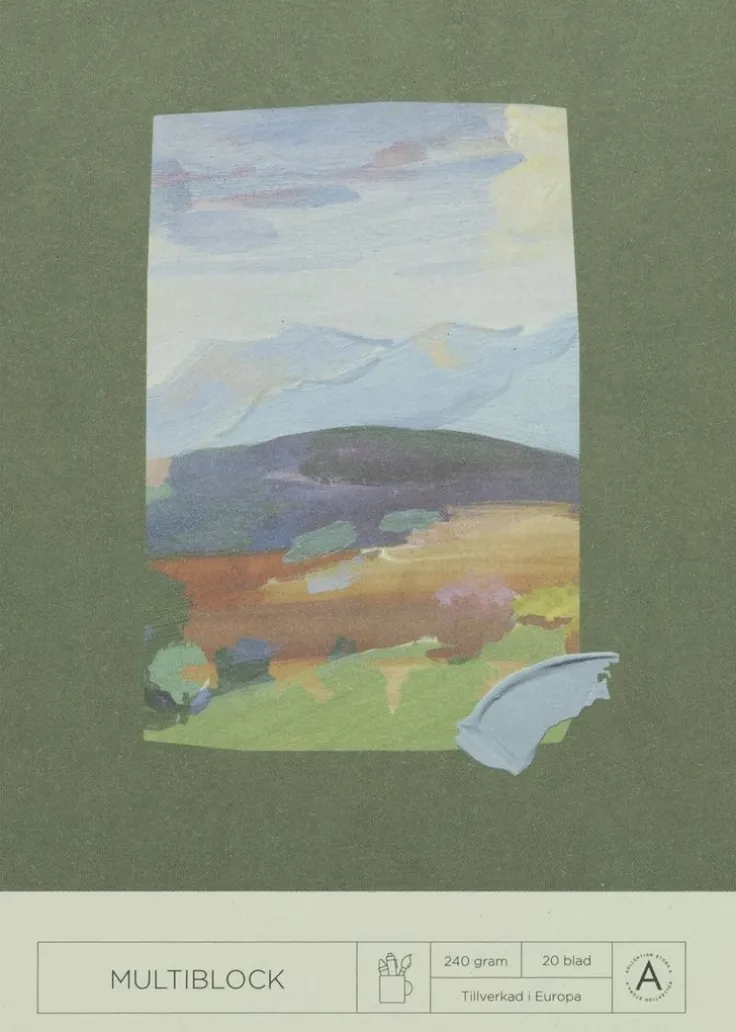 Multiblock i A5 format som passar perfekt för att blanda olika tekniker. Dess 20 blad har en ytvikt på hela 240 gram som gör att de ska klara av all kreativitet du kan tänka dig – akryl, blyerts, pastell, bläck! Bladen är även limmade och enkla att riva av vid behov. Blocket har ett motiv föreställande ett abstrakt landskap mot en mörkgrön bakgrund. Blocket är Svanenmärkt och tillverkad i Europa.240 g papper20 bladSvanenmärkt Ett block, oändliga möjligheter. Multiblocket ingår i Akademibokhandelns egen kollektion – Kollektion Stora A.