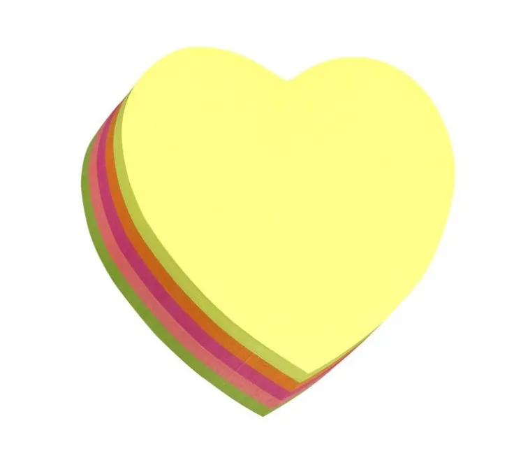 Hjärtformade notisblock som fäster överallt om och om igen utan att skada underlaget. 250ark i 5 olika färger 64x67mm.