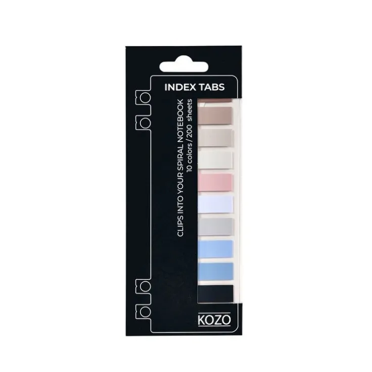 KOZO Indexflikar i snygga, neutrala färger är självhäftande och flyttbara för enkel märkning och organisering. Innehåller totalt 200 flikar i 10 olika trendfärger. Tillverkade av semi-transparent plast med matt yta som är enkel att skriva på. Indexflikarna sitter på ett transparent kort som du enkelt kan fästa och flytta runt i alla sorters spiralblock. Perfekt för att strukturera dina anteckningar på ett enkelt och snyggt sätt. Indexflikarna lämnar inga märken på underlaget de fästs på och passar därför bra för märkning i böcker, kurslitteratur etc. Matchar fint med övriga KOZO produkter och passar extra bra ihop med KOZO Premium Notebook.