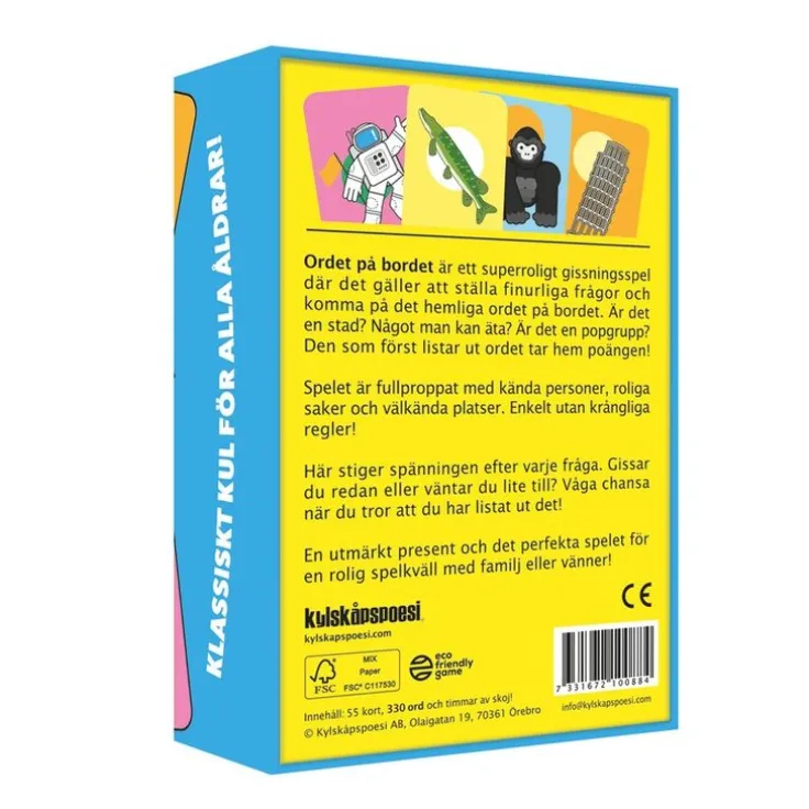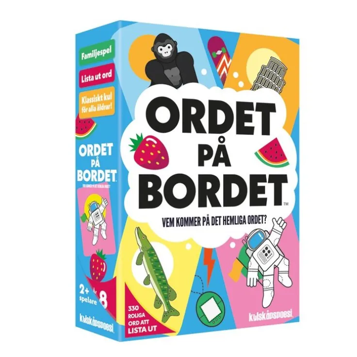 Ordet på bordet är ett superroligt gissningsspel där det gäller att ställa finurliga frågor för att komma på det hemliga ordet på bordet. Är det en stad? Är det något man kan äta? Är det en skådis? Den som först listar ut ordet tar hem poängen! Spelet är fullproppat med kända personer, roliga saker och välkända platser. Enkelt utan krångliga regler! Här stiger spänningen efter varje fråga. Gissar du redan eller väntar du lite till? Våga chansa när du tror att du har listat ut det!