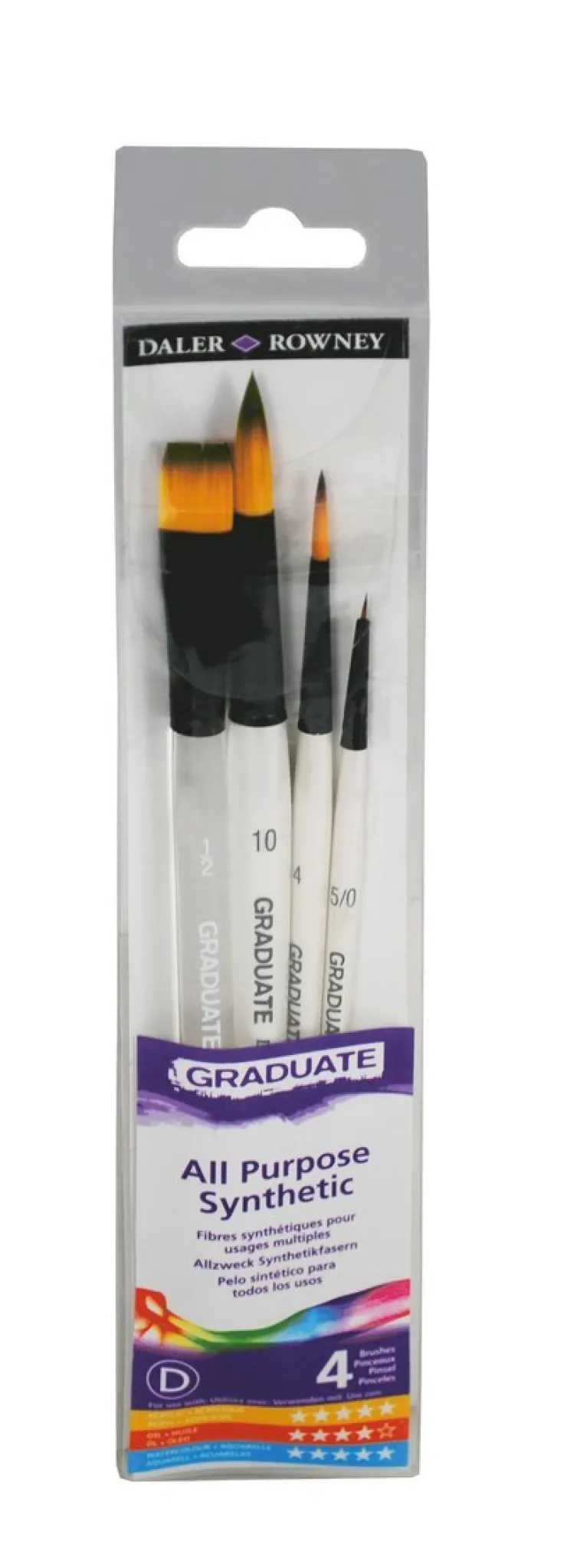 Penselset Daler-Rowney Graduate, för akvarellfärg. Syntet. 4 storlekar, rund: 5/0, 4 och 10. Platt: 0,5