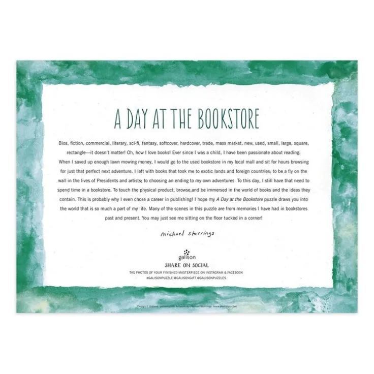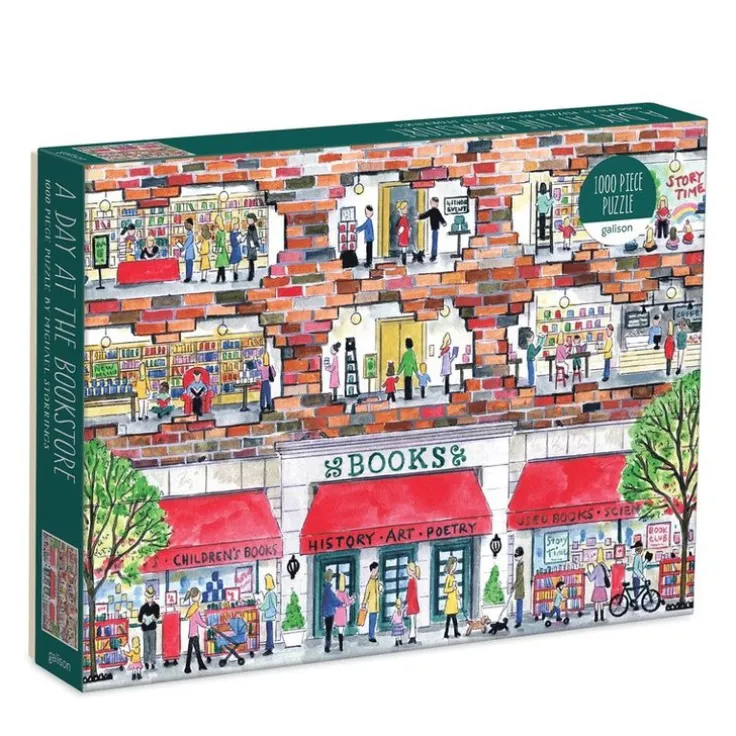Pussel med 1000-bitar i en stadig och dekorativ ask. Pusselbitarna är i kraftig kartong och med en len yta, fina att hålla i. Asken innehåller en exakt bild av det färdiga pusslet, som är bra att ha tillhands som referens. Det färdiga pusslet är 686 x 508 mm stort. Den prisbelönta designern och illustratören Michael Storrings fångar charmen en dag i en bokhandel. De olika avdelningarna inne i bokhandeln samt livet på gatan utanför, blir till tydliga färgfält som gör pusslandet både intressant och roligt att lägga.