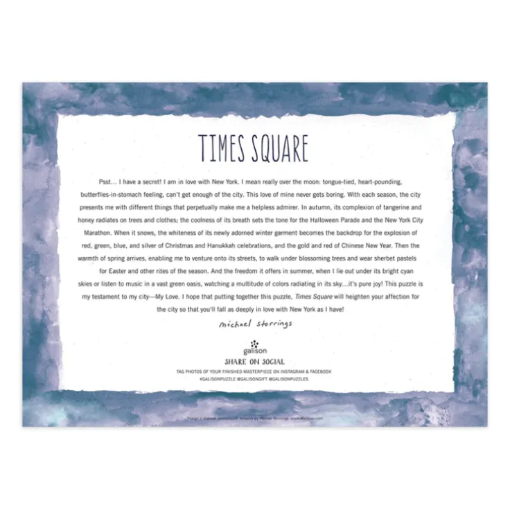 Ett 1000-bitars pussel med motiv av Times Square med alla dess gula taxibilar, reklamskyltar och människor. Pusslet vibrerar av liv och man blir sugen på att resa!Pusselbitarna är noggrant formade och har inga smulor eller damm. Asken innehåller en plansch med bilden. Pusslet ligger i en fin och stadig ask med matt yta som kan återanvändas till presenter, förvaring, mm.Pusslet är tillverkat av 90% återvunnet papper och asken av 70% återvunnet papper. Färgerna är helt giftfria.Pusselmotivets mått: 51 x 69 cmAskens mått: 29 x 21,5 x 5 cm