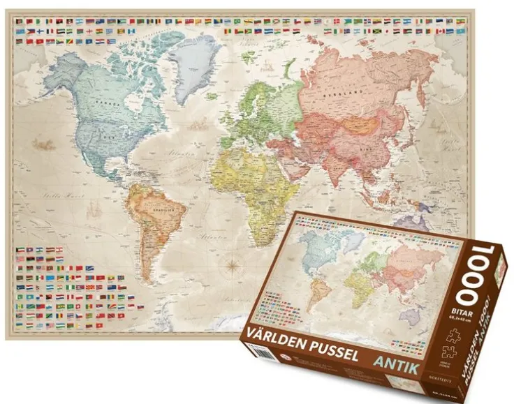 Världen Pussel Antik 1000 bitar är ett roligt sätt att umgås med familjen och samtidigt lära mer om världens geografi. Pusslet har en aktuell kartbild men som med färger och illustrationer ger en mer antik känsla. Hav, länder och ett urval städer är markerade. Pusslets storlek 68x48cm, svensk text.