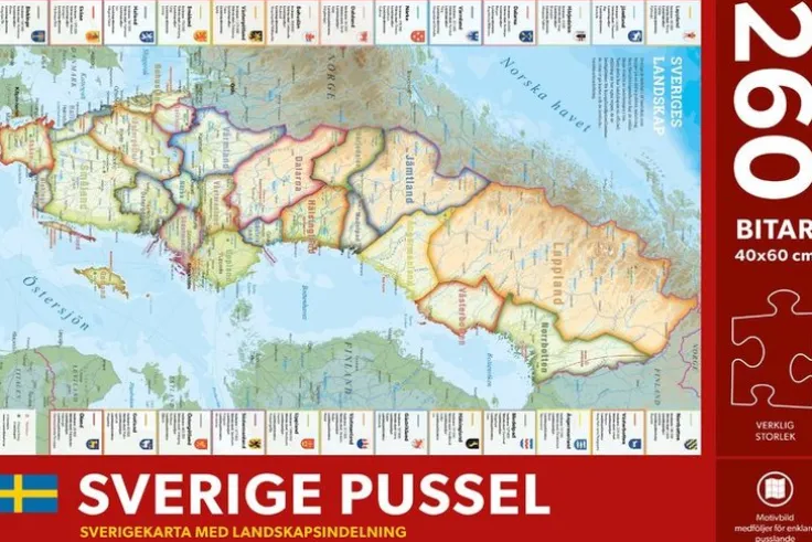 Sverigepussel i 260 bitar, ett roligt sätt att umgås och samtidigt lära mer om Sveriges geografi. Pusslet har en tydlig indelning av Sveriges 25 landskap där kartbilden inramas med en faktaruta för respektive landskap. På kartan visas landskapsnamn, ett urval städer, vägar, sjöar, älvar och berg. Olika färgnyanser i kartan ger en känsla av Sveriges topografi. Pusslets storlek 40x60cm, svensk text.
