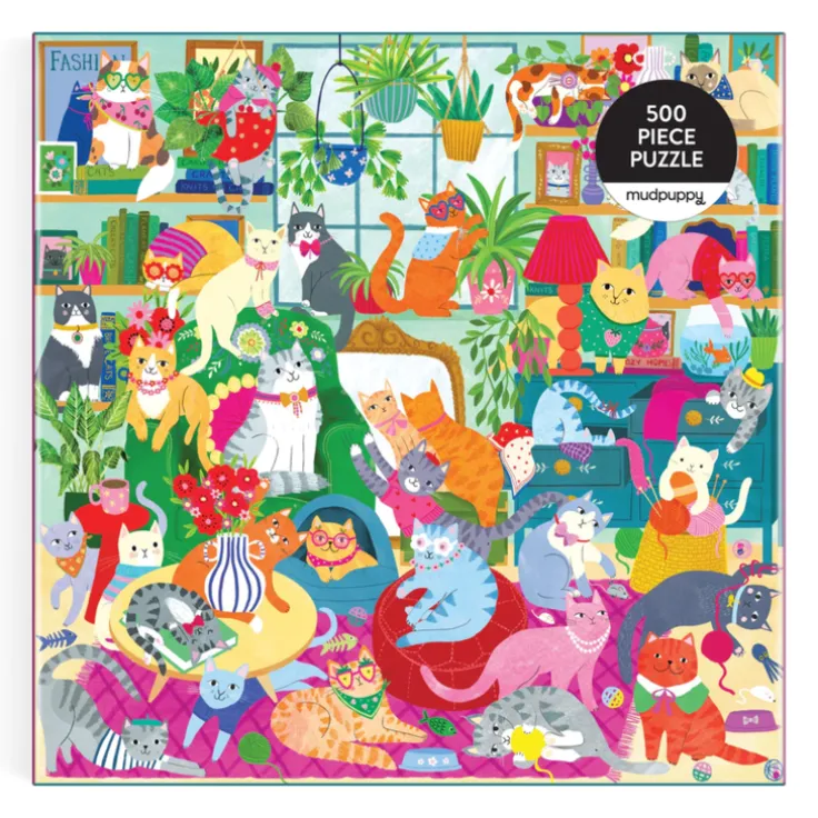 Ett 500-bitars pussel med en livlig vardagsrumsscen fylld med katter och massor av udda detaljer att upptäcka! Detta 500-bitars pussel har precis rätt nivå av utmaning för hela familjen att delta i och njuta av timmar av pusselnöje! Pusslet är förpackat i en stadig ask och en affisch med pusselmotivet i sin helhet ligger med. Fina släta pusselbitar utan pusseldamm. Det färdiga pusslets storlek är 508 x 365 mm.