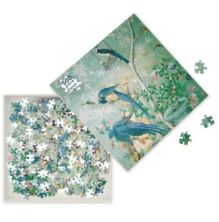 Ett 500-bitars pussel med ett vackert collage skapat av Lady Hertford, som ägde Temple Newsam House i Leeds, England. Lady Hertford klippte ut bilder från Audubons bok och satte dem på den handmålade kinesiska tapeten i hennes salong. Resultatet blev ett fantastiskt rum fyllt med en blandning av Audubons fåglar och de ursprungliga asiatiska trädgårdsfåglarna som fanns på tapeten. De två fåglarna till vänster här är Audubons skildringar av Columbia Jays, nu känd som svartstrupig skata.Pusslet är förpackat i en stadig ask och en bild med pusselmotivet i sin helhet ligger med.Det färdiga pusslets storlek är 490 x 360 mm