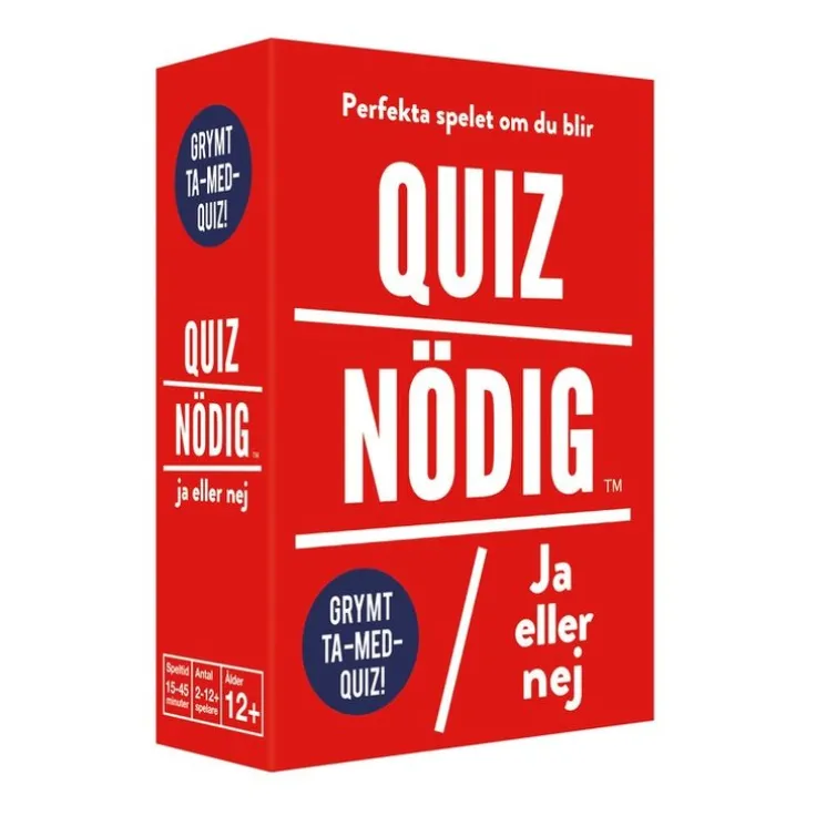 QuizNödig – Ja eller Nej?Perfekt att ha med om någon blir quiznödig!Får man ha en apa som husdjur? Kan man se Öland från Gotland? Är månen en planet? Och hur är det… är Stålmannens mantel blå?QuizNödig – Ja eller Nej? är ett medryckande spel med fler än 200 kul och annorlunda ja eller nej-frågor. Här tävlar alla mot alla och spänningen stiger snabbt för varje fråga!Perfekt för festen, middagen eller med familj och vänner!