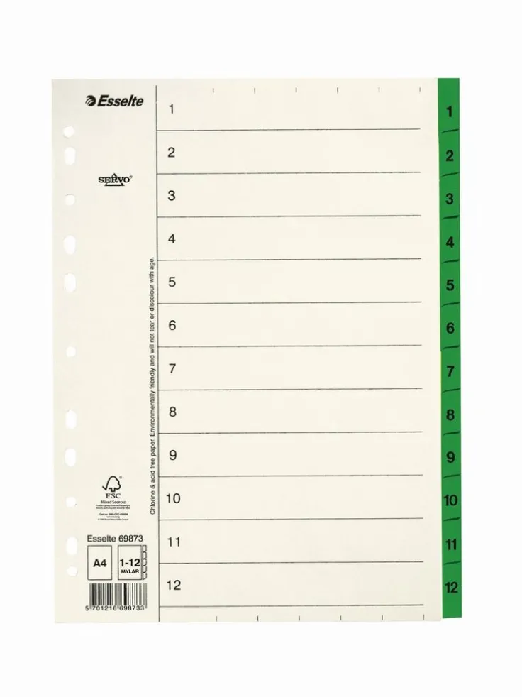 Esselte® Servo-avdelare ger enkel märkning och sortering med 1 förtryckt blad med 11 perforerade hål för universell användning. Esselte Servo-avdelarna är ett viktigt verktyg för organisering och kategorisering av kontors-, skol- och viktiga hemdokument. Varje Esselte Servo-avdelarblad levereras perforerat med 11 hål, vilket gör dem enkla att använda med en mängd mappar och pärmar med dokument. Du kan både skriva och trycka på FSC-certifierade Mylar Esselte Servo-avdelare och de kan skrivas ut med ett vanligt A4-format. Varje Esselte Servo-avdelarblad i kartong levereras förtryckt med 12 tydligt märkta utrymmen. – Avdelare för dokument och pärmar – Plastförstärkta flikar – Tillverkad av klor- och syrafritt Mylar-papper, kartong – FSC-certifierat – 12 avdelningar, märkta 1?12 – 11 perforerade hål på varje pappersark med fliketiketter för universell användning – Skrivbar i A4-format (210 x 297 mm) – Färg: Grön