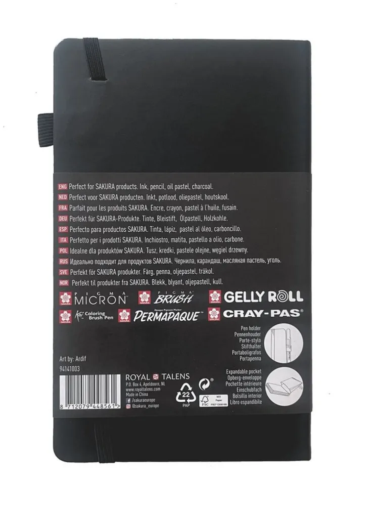 Sakura Sketch – Inbundet anteckningblock 13X21 cm med 80 offwhite ark i 140 g/m2 syrafritt papper. Lämpliga för alla åldrar. Perfekt till Sakura produkter tuschpennor, oljepastel och kritor. Inklusive en pennahållare och en utvidgbar ficka längst bak i boken.Art by: ARDIF
