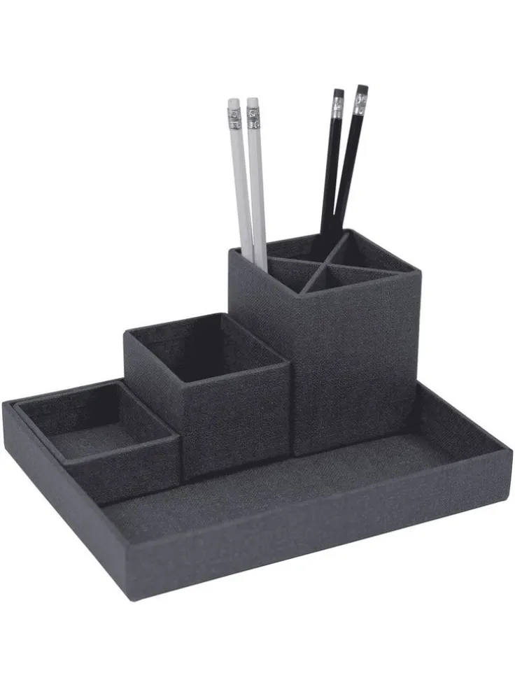 Lena skrivbordsställ från svenska familjföretaget Bigso – Skrivbordsförvaring i 4 delar som hjälper dig att organisera pennor, gem, laddare och andra skrivbordstillbehör. De tre kopparna är lösa och kan lätt plockas ur vid behov. Med gummifötter som skyddar underlägget och ökar stabiliteten. Stark konstruktion som tål att användas varje dag. Ingår i en snygg och stilren skrivbordserie från Bigso som passar lika bra på kontoret som hemma, där du vill ha ordning och reda. Kan staplas med brevkorgen Håkan, clips medföljer.Tillverkad av 100% återvunnen fiberpapp med ett ytskikt av präglat papper vars textur liknar grovt linneväv.Detta ger produkten ett rustikt, men samtidigt stilrent och modernt utseende.Mått: 23,5x18x11 cm
