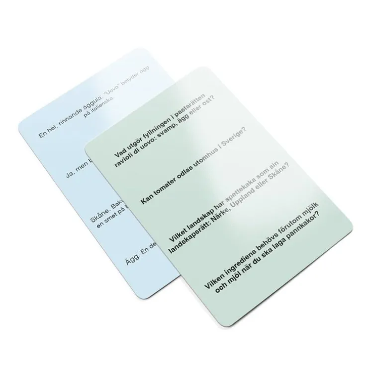”Mat är gott, och nödvändigt. Och visst är det roligt med frågor om mat. Här finns 380 frågor i olika svårighetsgrader, men det är inte säkert att vuxna klarar det här bättre än de yngre deltagarna.”
