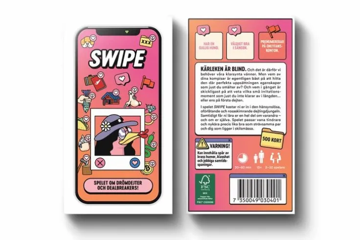 Kärleken är blind. Och det är därför vi behöver våra klarsynta vänner. Men vem av dina kompisar är egentligen bäst på att hitta den där perfekta uppsättningen egenskaper som just du smälter av? Och vem i gänget är skickligast på att veta vilka små irritationsmoment som just du inte klarar av i längden… eller ens på första dejten. I spelet SWIPE kastar ni er in i den hänsynslösa, oförlåtande och rosaskimrande dejtingdjungeln. Samtidigt får ni lära er en hel del om varandra – och om er själva. Spelet passar vana tindrare och nykära precis lika bra som strävsamma par och dig som ligger i skilsmässa.Innehåll: 250 kort ””Egenskaper”” 250 kort ””Red Flags”” 1 regelhäfte3-20 spelare Speltid 30-60 minuter Rek. ålder från 15 år