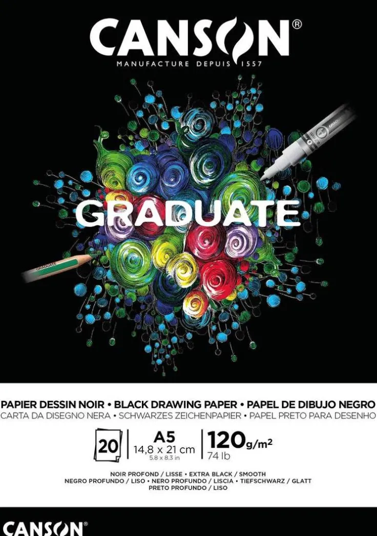 Graduate Black Paper Pad i A5 format innehåller 20 ark 120gsm slätt svart papper som är perfekt för användning med grafit, färgpennor, fiberspetspennor och akrylmarkörer. Syrafritt och FSC-certifierat papper tillverkat i Frankrike.