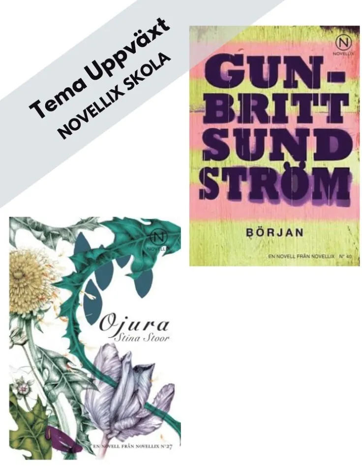 Novellix ger ut noveller i små böcker med en berättelse per bok. I paketet med Tema Uppväxt ingår två noveller med tillhörande lärarhandledningar. Gun-Britt Sundströms Början handlar om Malin vars son Noa blir utsatt för mobbning i skolan. Stina Stoors Ojura är skriven ur barnets perspektiv och skildrar ömsint gränslandet mellan barnets fantasivärld och den hårda, ibland obegripliga vuxenvärlden.