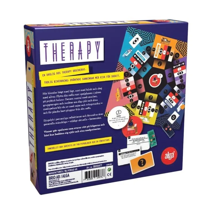 Ett feel goodspel som tar pulsen på mänskligheten. En daglig dos Therapy ordineras. Trolig biverkning: Oväntade sanningar med risk för skratt. Här blandas högt med lågt, sant med falskt och skoj med allvar. Flytta din soffa runt spelplanen i jakten på psykisk balans. Genom samtal med coachen, gruppterapin och insikter om dig själv och dina medspelare blir du av med nojor och tvångstankar – och får plocka bort markörer från din soffa. Djupdyk i personliga reflektioner och förundras över generella mänskliga – väldigt aktuella – beteenden. Vinner gör spelaren som svarar rätt på frågorna och bäst kan bedöma sig själv och sina medpatienter. Innehållet har skrivits av två psykologer och en författare.