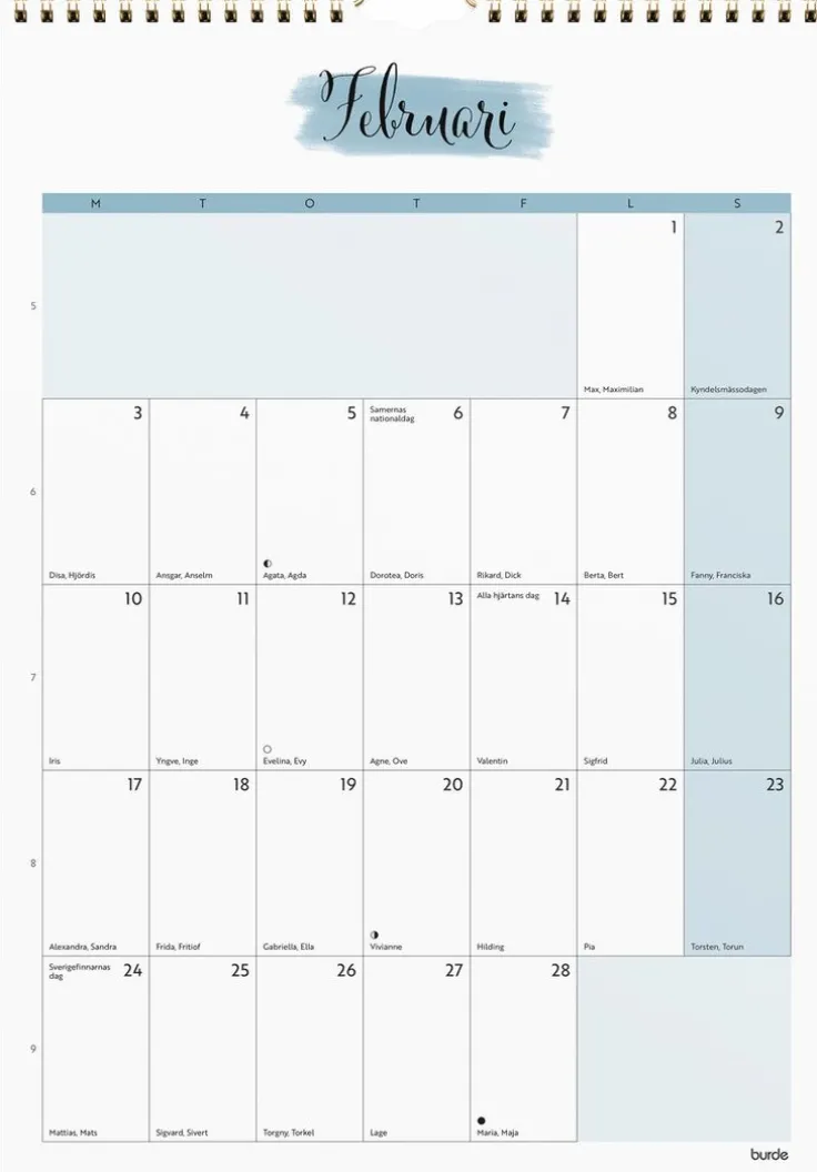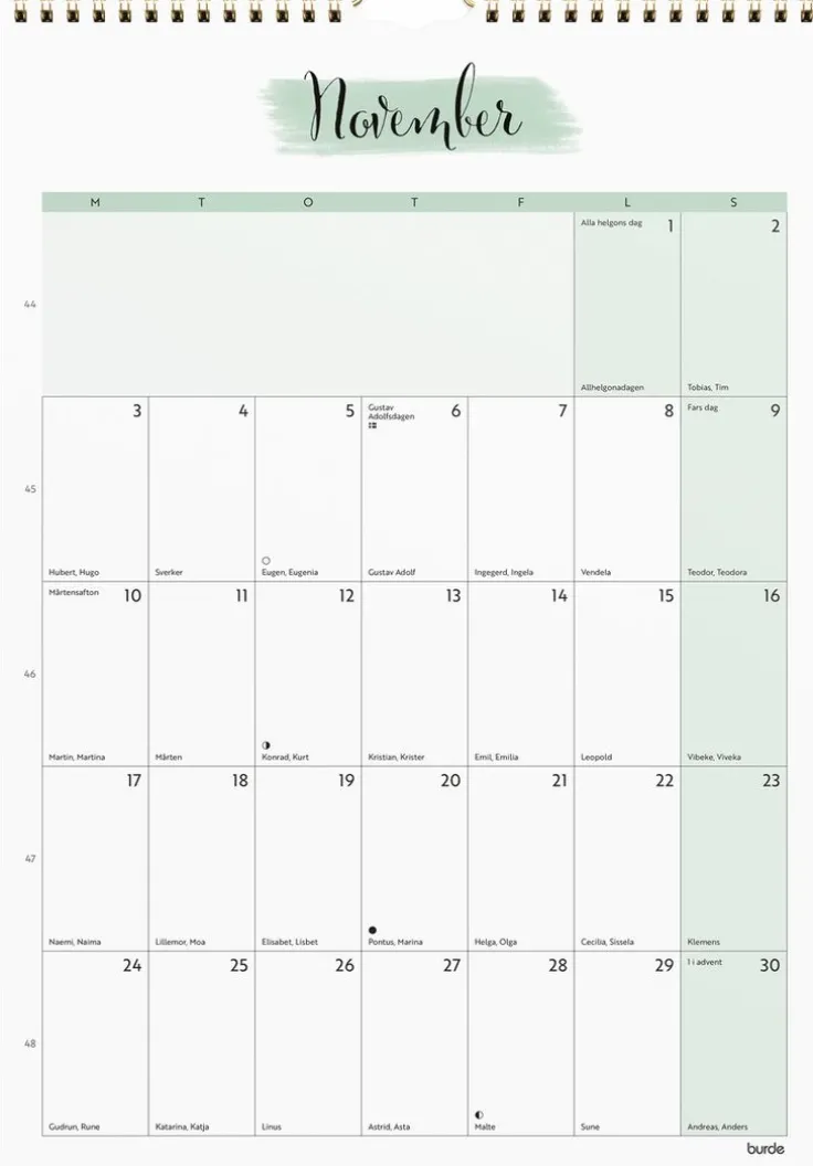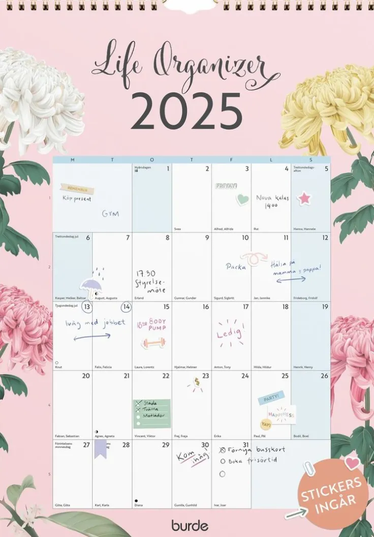 Väggkalender i A3-format med gott om plats att organisera och planera vardagslivet. Trendig layout och stilrena pastellfärger gör kalendern lättplacerad. Piffa med medföljande stickersark och skapa en personlig planering!Väggkalender 2025 från Burde. Format: A3. Layout: Månad/blad. Kalendarium: 2025-01-01 – 2025-12-31. Spiralbunden. Innehåll: Stickersark. Antal sidor: 12. Miljöinformation: FSC®.