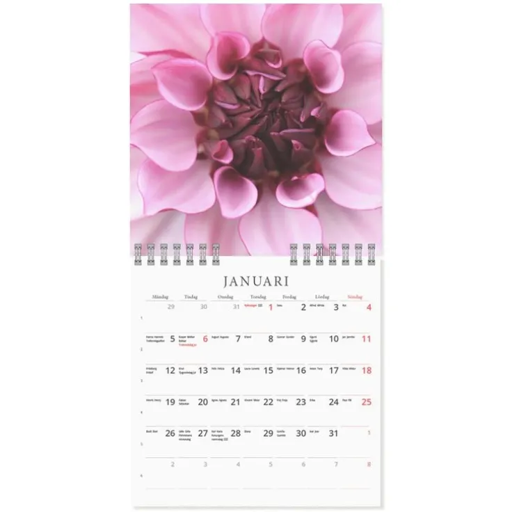 Väggkalender Blossom Mini 2026 med närbilder på vackra blommor. Svenska namndagar och helgdagar. Kalendern är producerad och tryckt i Sverige på svenskt papper. Märkt med både Svanen och FSC.