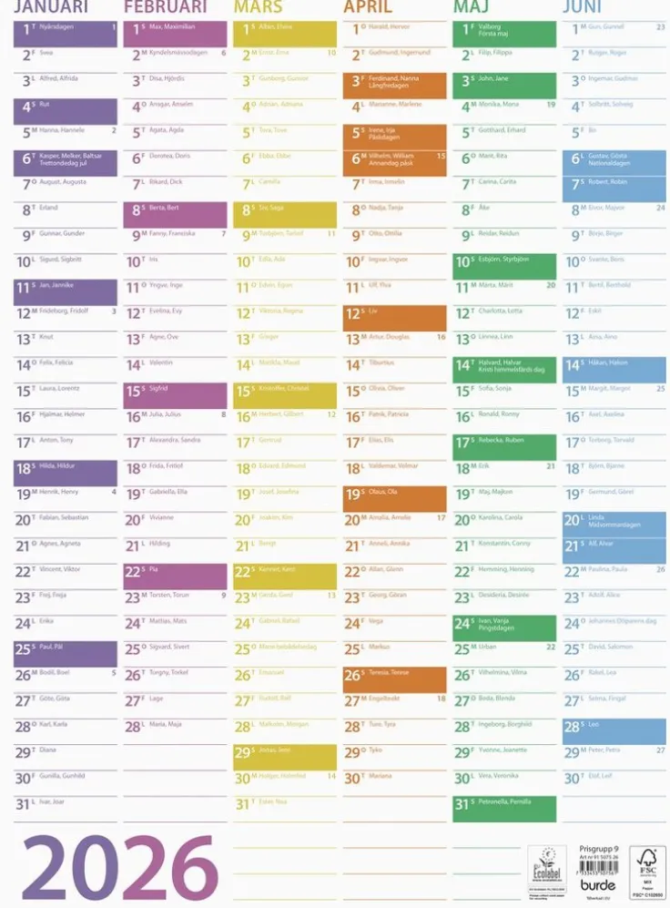Väggkalender 2026 från Burde. Format: 360×490 mm. Layout: Halvår/sida. Kalendarium: 2026-01-01 – 2026-12-31. Innehåll: Helgdagar, namnsdagar, anteckningssidor. Antal sidor: 2. Miljöinformation: FSC®. Ecolabel.