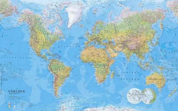Kartförlagets klassiska världskarta med svensk text pryder sin plats på väggen. Kartan visar genom höjdskuggning tydligt berg och bergskedjor, tillsammans med djupskikt i oceaner och hav ger det liv åt kartan. gränser, huvudstäder och övriga större städer visas i varje land. Format 137x85cm.
