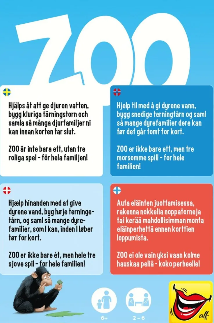 Tre spel i ett! Hjälps åt att ge djuren vatten, bygg kluriga tärningstorn och samla så många djurfamiljer ni kan innan korten tar slut. Zoo är inte bara ett, utan tre roliga spel – för hela familjen!Innehåller spelregler på svenska, norska, danska och finska.