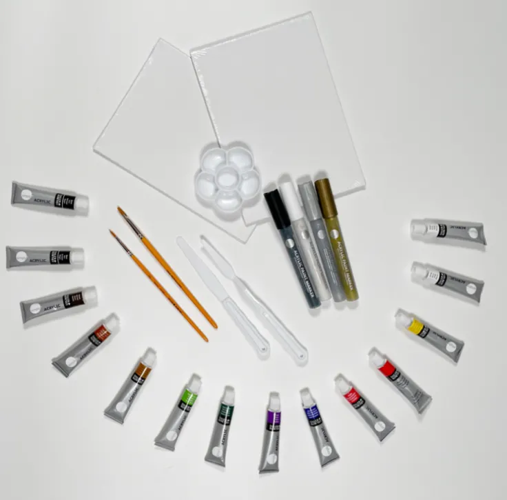 Prisvärt målarset från Daler Rowney, ett perfekt startset för den som önskar komma igång med att måla med akrylfärger. I den praktiska träväskan ryms allt som behövs: 14 tuber med akrylfärg som har hög ljusäkthet och kan användas på många ytor, 2 penslar, 4 akrylpennor, 2 palettknivar, 1 palett, 2 pannåer samt 1 färgblandningsguide. Allt kommer i en gedigen träväska med metallbeslag.