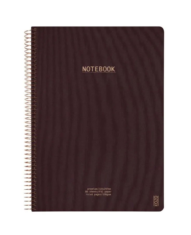 KOZO Premium anteckningsbok är definitivt en av de snyggaste anteckningsböckerna på marknaden. Det kraftiga canvasomslaget med vackra detaljer i brons och den kaxigt stora spiralen, även den i brons, gör den perfekt att skriva och ta anteckningar i, både när du har den liggandes i knät eller till och med stående utan stöd. Och givetvis en vacker inredningsdetalj till ditt skrivbord. Att skriva på det cremefärgade 100 g pappret ger en lyxig känsla. Alla 80 sidor i anteckningsboken har en datumrad uppe till höger, enkelt och praktiskt. Matchar alla andra KOZO skrivbordsartiklar i samma färgnyanser.