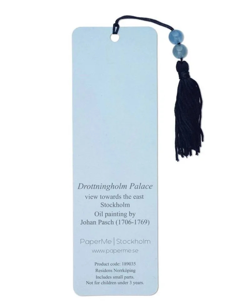 Bokmärke med tofs och två pärlor. Den vackra oljemålningen av Johan Pasch (1706 – 1769) av Drottningholms slott är på framsidan av det här bokmärket. Slottet är avmålat från den östra sidan. Rundade hörn. FSC märkt papper.